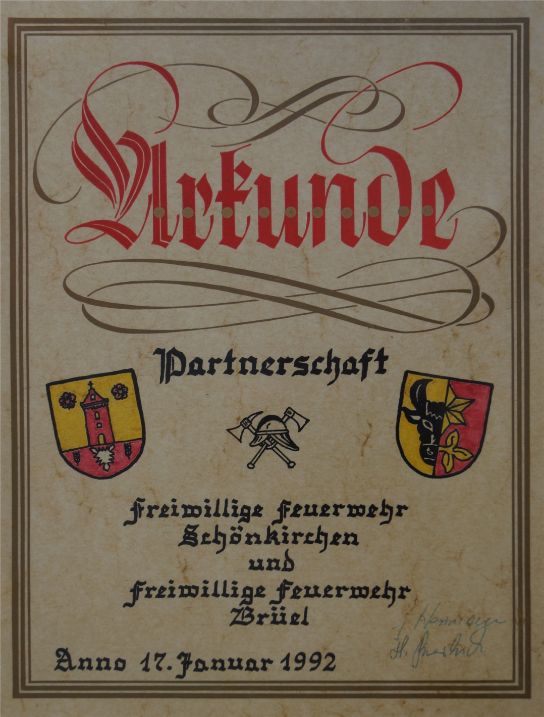 Am 17.Januar 1992 wurde es besiegelt und die Partnerschaft zwischen unserer Wehr und der FFw aus Schönkirchen geschlossen.