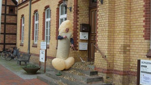 Am Samstag, 05.04.2014 feierte unser Kamerad Martin Lahs seinen 30. Geburtstag. Wie so üblich gratulierten die Kameraden der FFw Brüel auf Ihre Weise. Somit wurde er im rosa Schweinchen Kostüm von zu Hause abgeholt und in einer Buchte auf einem Anhänger zum Rathaus gefahren. Unmengen an Kronkorken und ein immer wieder zusammenklappender Besen erschwerten die Reinigung der Rathaustreppe. Nach ca. 30 min hatte die 3 jährige Lina aus der Menge der zahlreichen Zuschauer den befreienden Kuss gegeben.