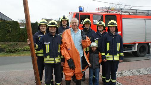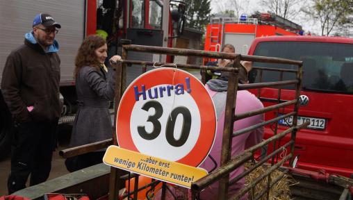 Am Samstag, 05.04.2014 feierte unser Kamerad Martin Lahs seinen 30. Geburtstag. Wie so üblich gratulierten die Kameraden der FFw Brüel auf Ihre Weise. Somit wurde er im rosa Schweinchen Kostüm von zu Hause abgeholt und in einer Buchte auf einem Anhänger zum Rathaus gefahren. Unmengen an Kronkorken und ein immer wieder zusammenklappender Besen erschwerten die Reinigung der Rathaustreppe. Nach ca. 30 min hatte die 3 jährige Lina aus der Menge der zahlreichen Zuschauer den befreienden Kuss gegeben.